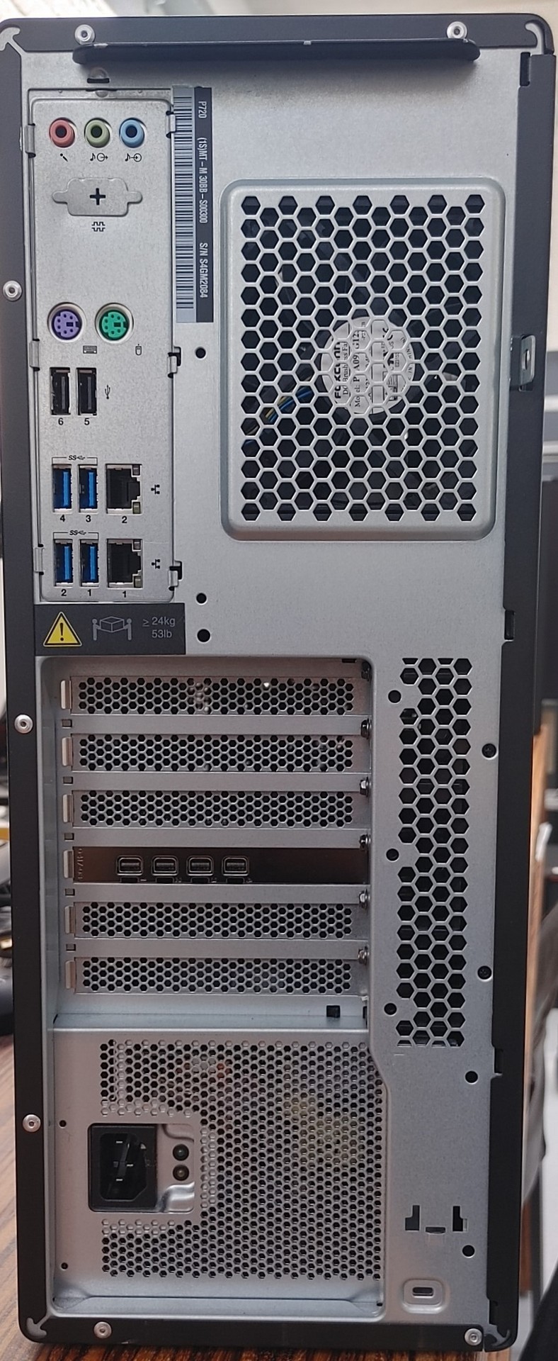 - achteraan: 6 USB (4x 3.2 + 2x 2.0) poorten, mic, line-in & -out, dual 1Gb Ethernet, PS2 voor muis en keyboard, 4 mini-DisplayPort voor schermen, 220V