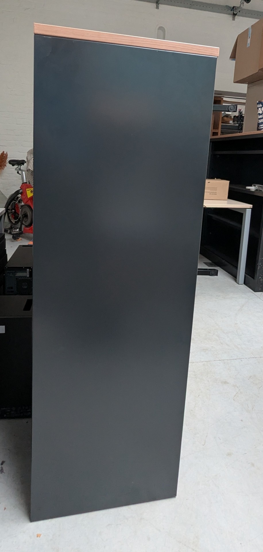 - metalen kast - kleur antraciet / zwart - kunststof roldeuren - houten topblad - 3 legplanken - zonder sleutel - 4 instelbare voetjes