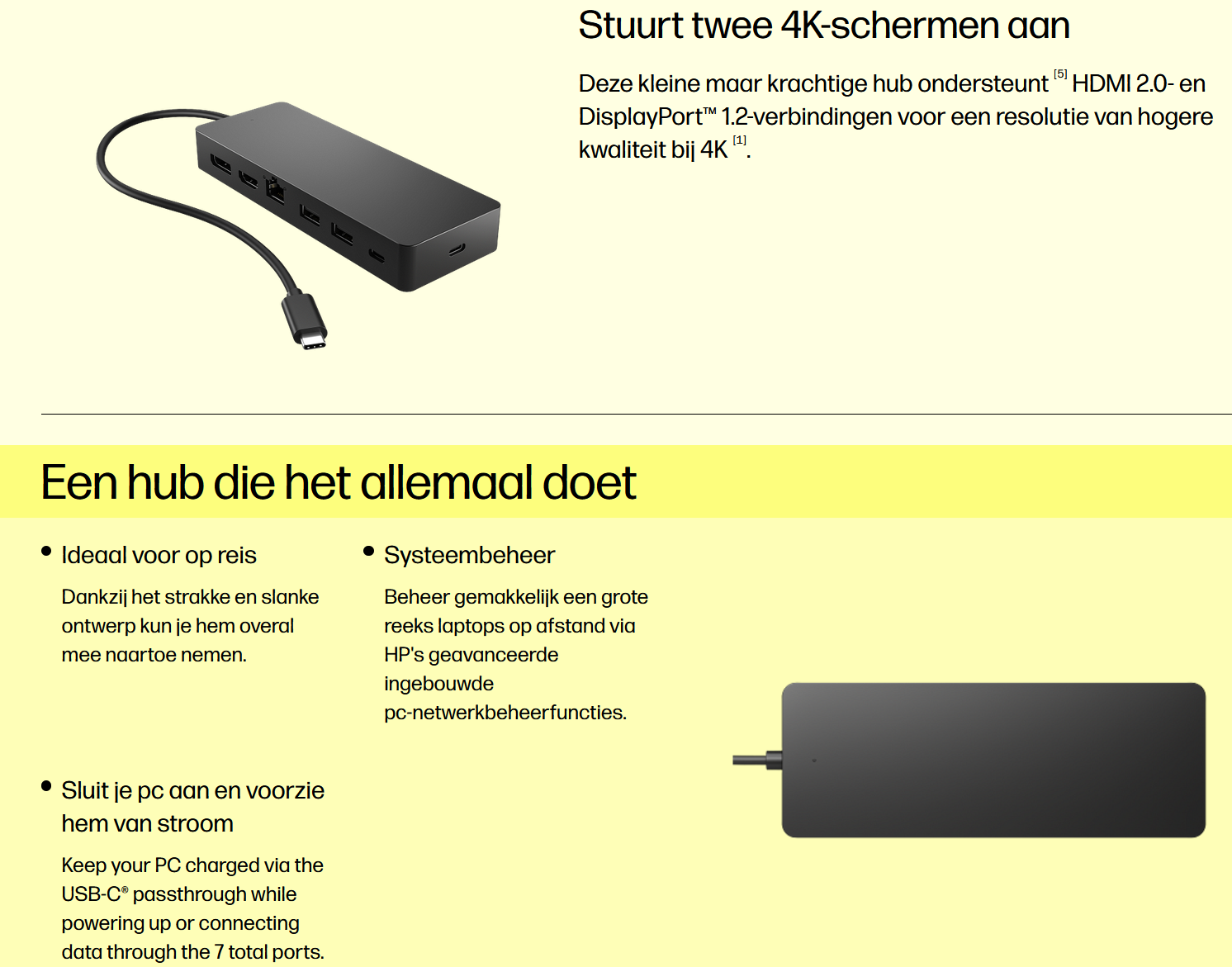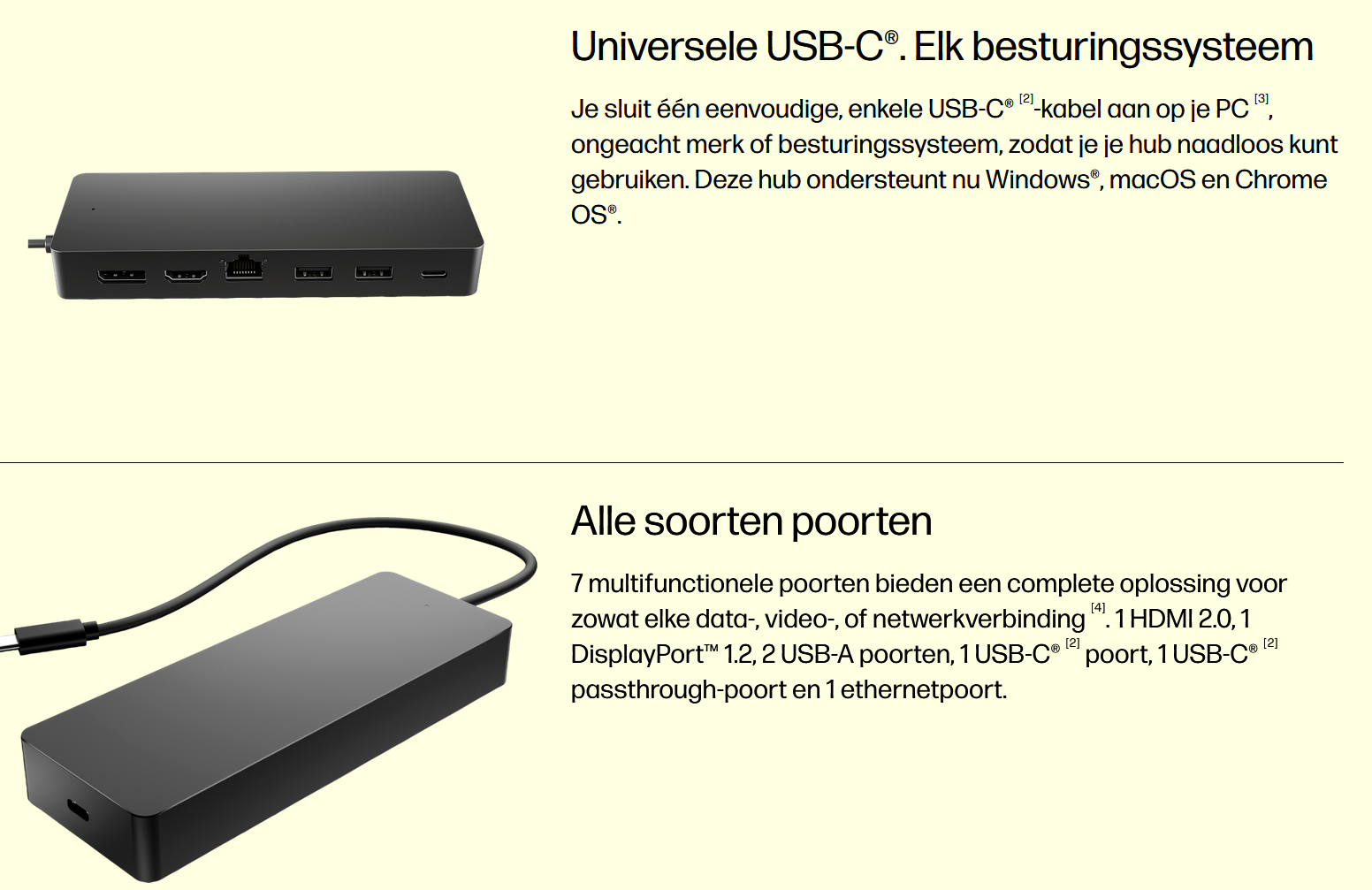 Profiteer van de mogelijkheden van de HP Universal USB-C Multiport hub, die nu elke met USB-C® 1 compatibele pc ondersteunt. 7 poorten, 1 stroom- en datadoorvoerkabel, en veel randapparatuur om via plug-en-play aan te sluiten.